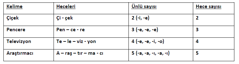 Bir sözcüğü hecelerine ayırırken ünlü harf sayısına bakarız. Heceler arasına kısa çizgi ( - ) koyarak belirtiriz.
