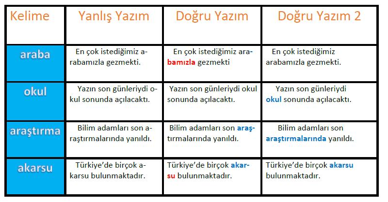 Satır sonuna sığmayan sözcükler hecelerine göre ayrılır bir heceyi bölerek ayıramayız. Bu konuda dikkat edilmesi gereken en önemli kural sesli harflerin tek başına hece olabilmesine rağmen satır sonunda tek başlarına yazılamamalarıdır.