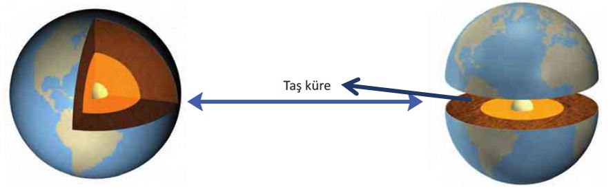 Taş Küre (Yer kabuğu) Günlük yaşantımızı sürdürdüğümüz, üzerinde canlıların yaşadığı Dünya’nın katı yüzeyi, taş küre katmanını oluşturur. Yer kabuğu olarak adlandırılan taş küre Dünya’nın gözlemlenen üç katmanından biridir. Taş Küre (Yer Kabuğu); Dağlar, ovalar, adalar, kıtalar, deniz ve okyanus tabanlarından oluşur. Dünya’nın büyüklüğüyle karşılaştırıldığında çok incedir. Yer kabuğunun kalınlığı yüzey şekillerine göre değişmektedir. Yerkabuğu, dağların olduğu yerde kalın, okyanus diplerinde ise incedir. Toprak ve çeşitli kayaçlardan oluşur. İçine inildikçe sıcaklık artar. |