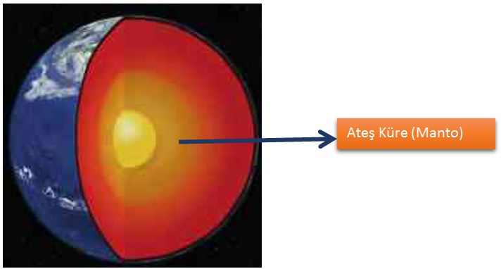 Ateş küre: Dünya’mızın gözlemlenemeyen katmanlarından olan ateş küre yer kabuğunun hemen altında bulunur. Manto olarak da adlandırılan bu katmanın; Yer kabuğunun (taş küre) altında yer alır. Sıcaklığı yerkabuğu ile karşılaştırıldığında çok yüksektir. Bu katman çok sıcak olup büyük oranda erimiş demir, magnezyum ve kalsiyum içerir. Bu maddeler magmayı oluşturur. |